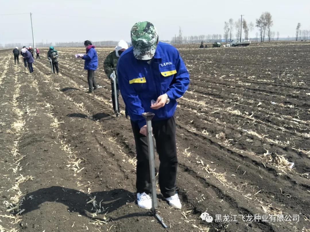 飛龍種業(yè)科研育種基地主要采用人工播種。播種前,科研人員根據(jù)播種需求調(diào)好自制播種器的尺寸。播種時,手持播種器插入壟臺正中,每次投放兩粒種子,再用腳踩實即可。