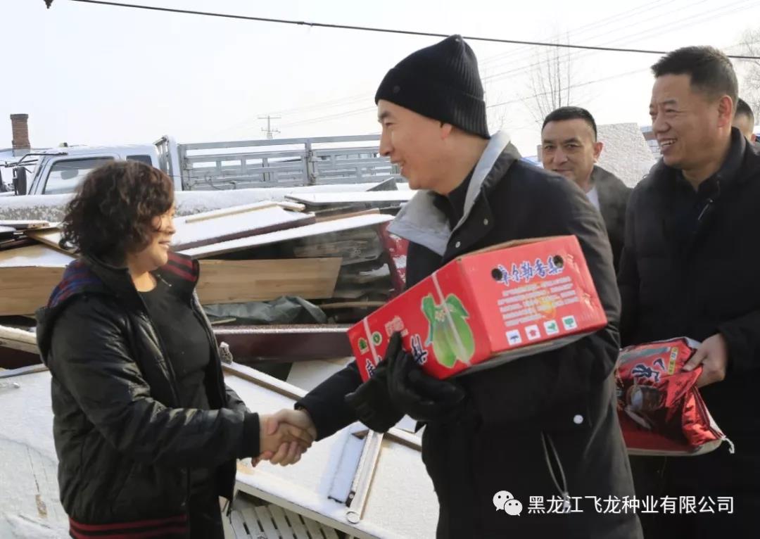 1月20日,工商聯(lián)齊海波書(shū)記、各村屯領(lǐng)導(dǎo)、飛龍種業(yè)林志達(dá)總經(jīng)理以及員工們逐一深入到福利鎮(zhèn)、集賢鎮(zhèn)、永安鄉(xiāng)、腰屯鄉(xiāng)李福臣、王喜軍、呂海濱等11戶(hù)群眾家中,把春節(jié)的禮物送給他們,讓他們從心里受到全社會(huì)對(duì)困難群眾的關(guān)愛(ài)之情。除了米面油、水果、醬油醋、深海刀魚(yú)和瓜子花生糖果等生活必需品以外,還根據(jù)不同需求送去了炕席、刮胡刀、藥品、衣物等。